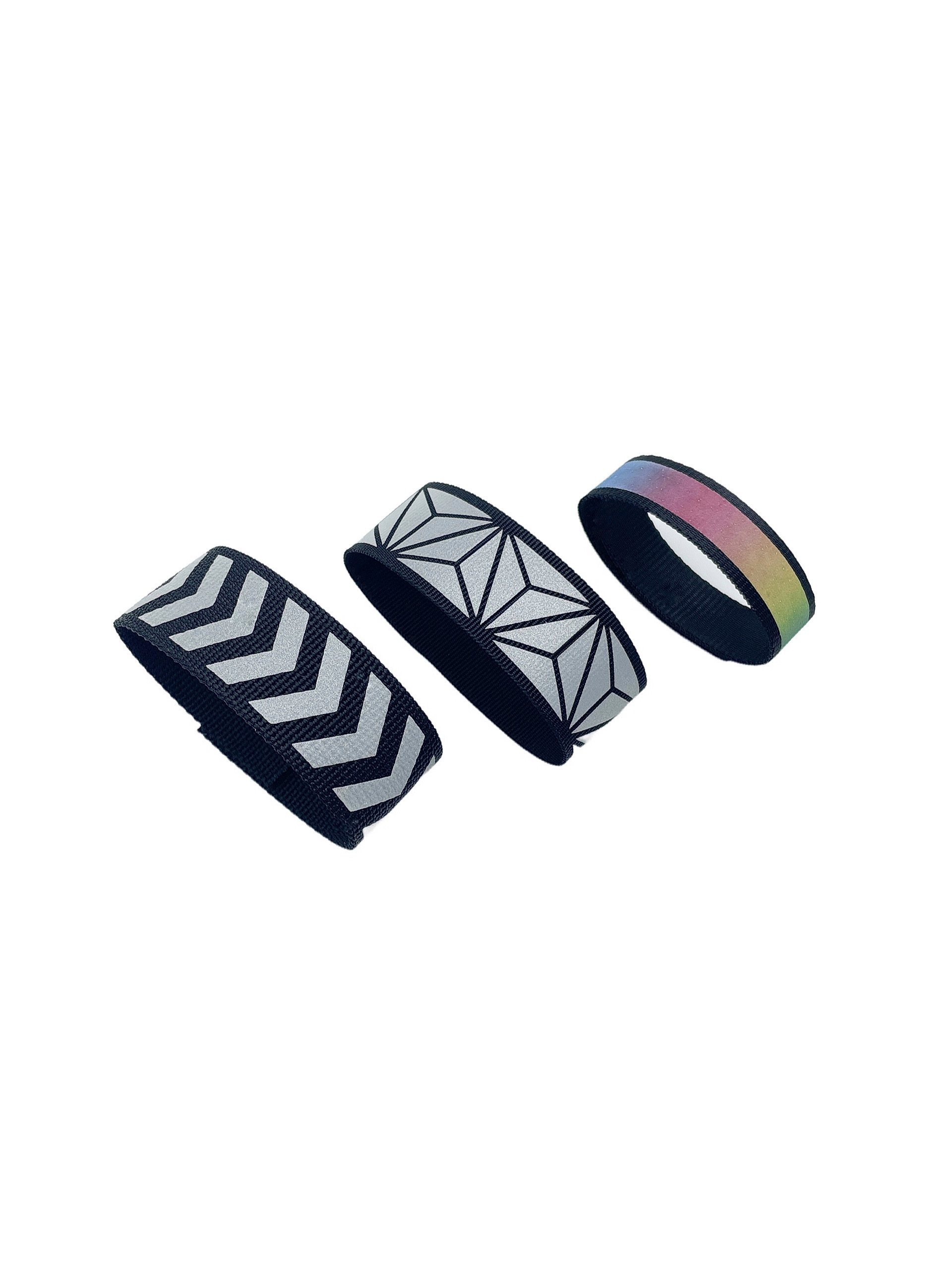 Reflective straps for pet leashes, collars, and harnesses.